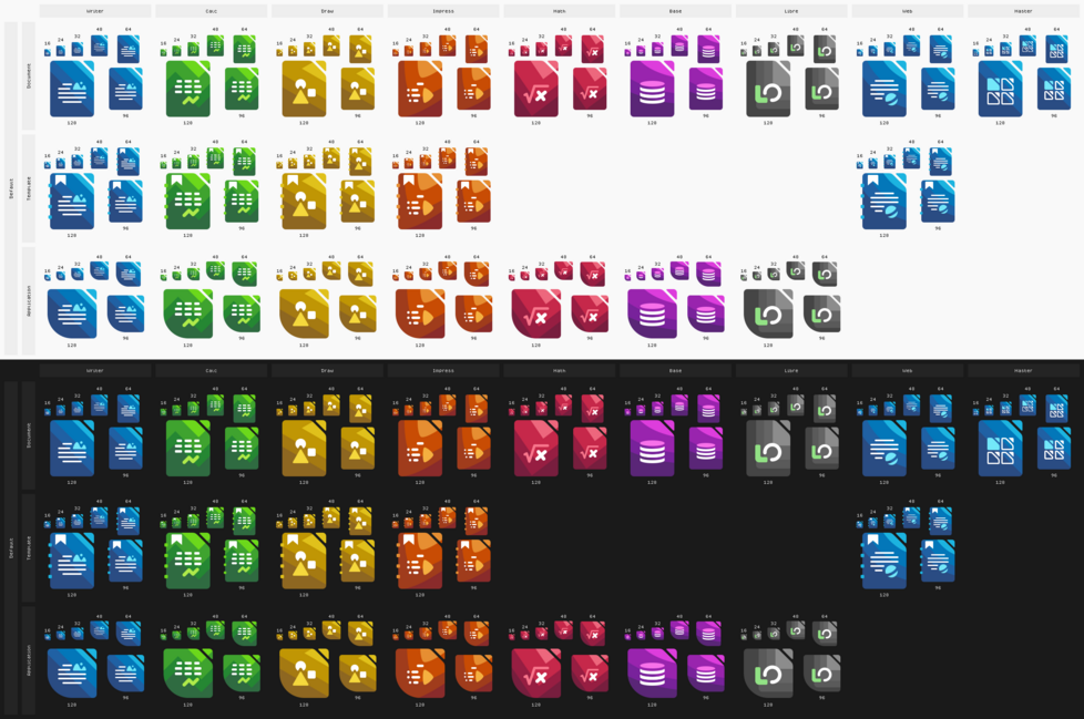 Since then I've been away from the LibreOffice design team, but today I had a feeling to resume my contribution work and to create a new version for these icons that I love so much. I tried to keep them close to the old ones in terms of shape and elements, just adapting some forms, colors, and the overall style.