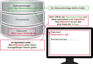 Um Dokumentvorlagen verwenden zu können, müssen sie als solche in einer LibreOffice Kategorie (einem Vorlagenordner) von LibreOffice gespeichert sein.